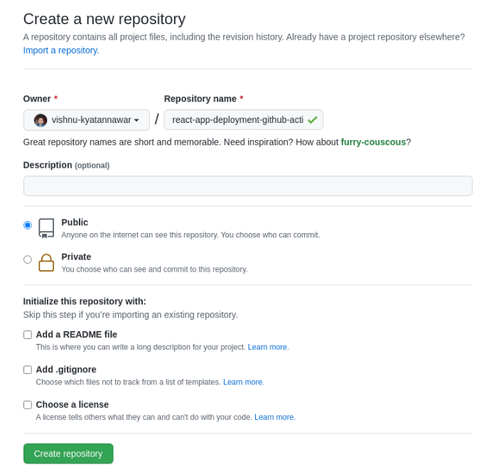 For this project I used react-app-deployment-GitHub-action as the repo name.